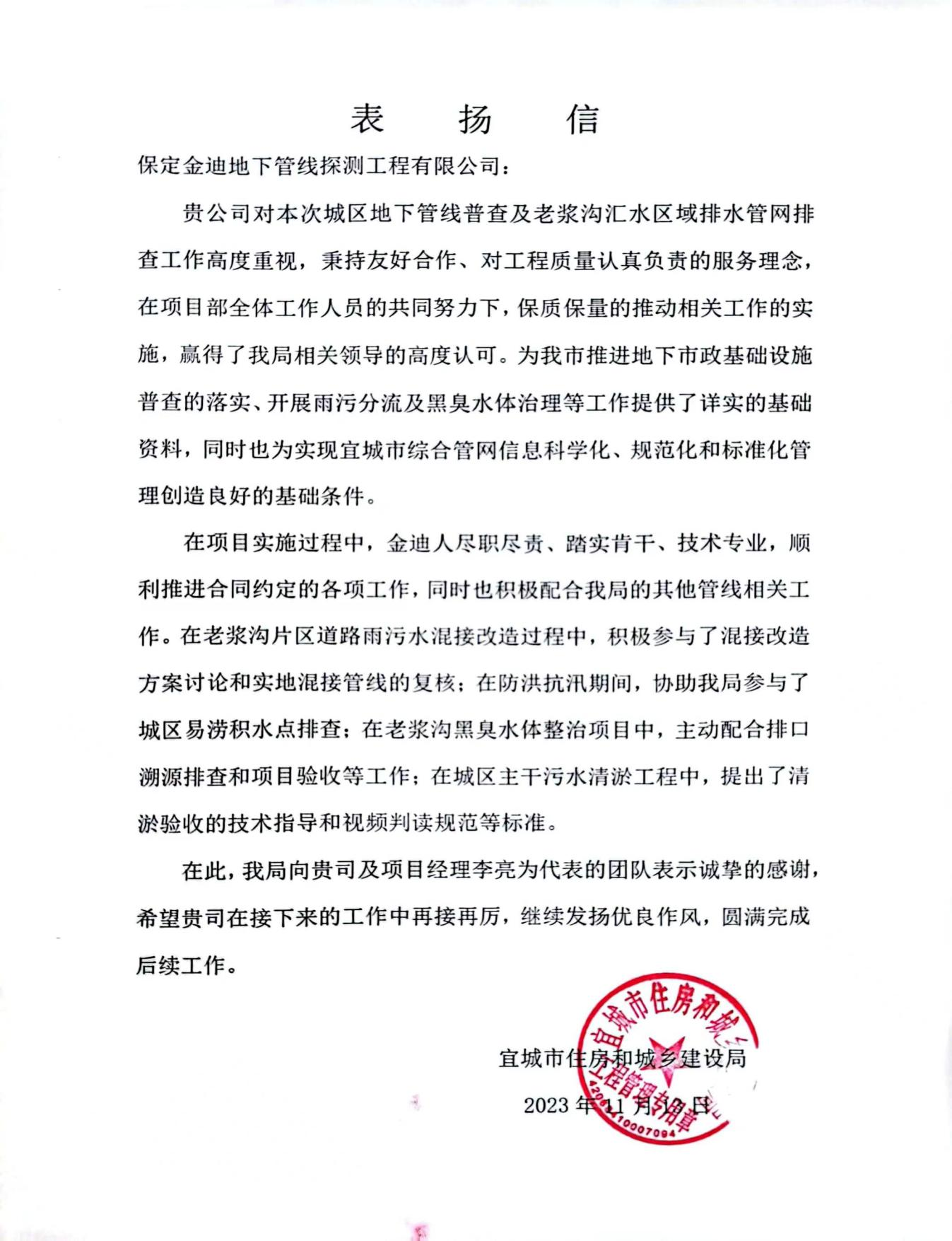 本次宜城市地下綜合管網(wǎng)普查及老漿溝匯水區(qū)域排水管網(wǎng)排查項(xiàng)目于2023年3月底進(jìn)場(chǎng),4月初開(kāi)始施工,在項(xiàng)目全體工作人員的共同努力下,保質(zhì)保量完成了各項(xiàng)工作內(nèi)容,贏得了宜城市住房和城鄉(xiāng)建設(shè)局相關(guān)領(lǐng)導(dǎo)的高度認(rèn)可。